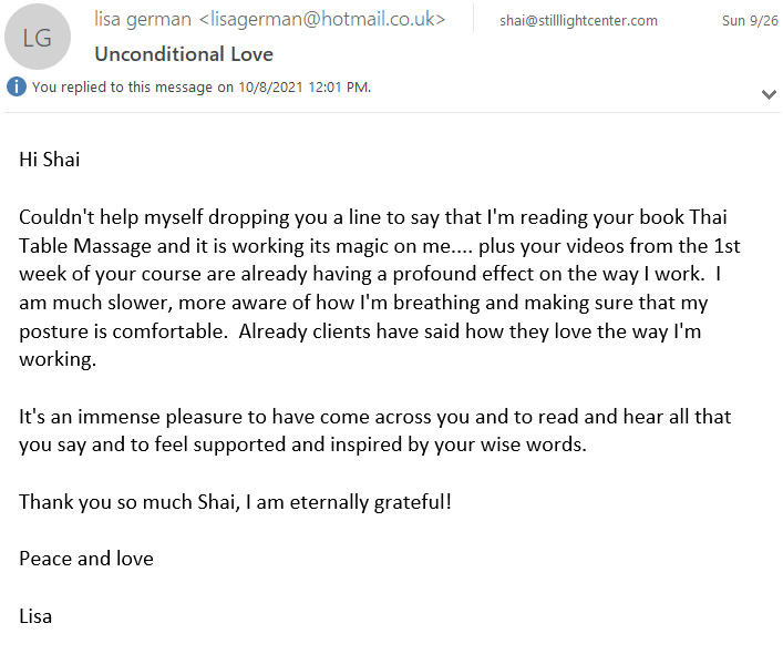 That giving Thai Massage is at least as good as receiving. What’s more, the more you give, the better. Not only for them, but for you as well.